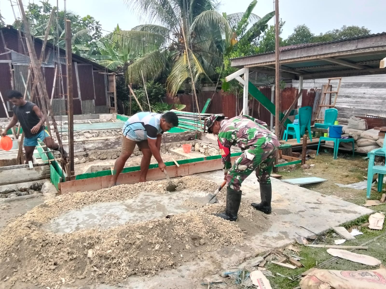 Tanpa ragu, Serda Zainal Abidin Syah berbaur bersama warga lainnya, mulai dari mengaduk pasir dan semen hingga turut serta dalam pengecoran pondasi rumah. Kehadiran Babinsa tersebut tidak hanya membantu mempercepat proses pembangunan, tetapi juga memberikan motivasi serta semangat gotong royong kepada masyarakat.